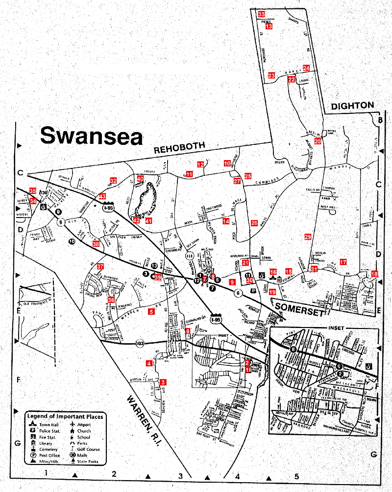 There are 49 documented historical cemeteries located in Swansea. The map below shows a rough estimate of where they are located. Cemetery numbers corresponding to the list below are noted in red squares.
