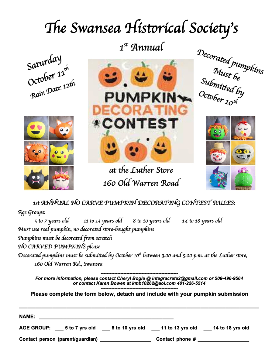 Please be sure to drop off pumpkins for the Pumpkin Decorating Contest tomorrow, Friday, between 3 pm and 5 pm at the Luther Store. Make sure you fill out the bottom of the form on the flier to include with your pumpkin. Judging will take place at 1 pm on Saturday.
