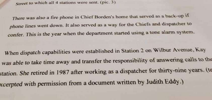 Kay Eddy was a dispatcher for the Swansea Fire Department. She was the wife of Deputy Chief Russell Eddy. On June 26, 1951, Kay officIally became the "voice of K-C-B, 6-1-5".  She retired in 1987 after working as a dispatcher for thirty-nine years.
